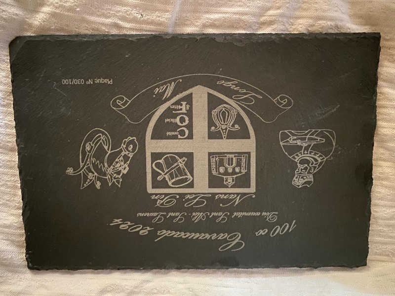Ce repose plat en ardoise est gravé par nos bénévoles, disponible en série limitée à 100 exemplaires. chaque pièce est unique car numérotée (et vous pourrez même choisir le numéro, dans la limite des disponibilités).